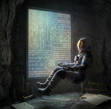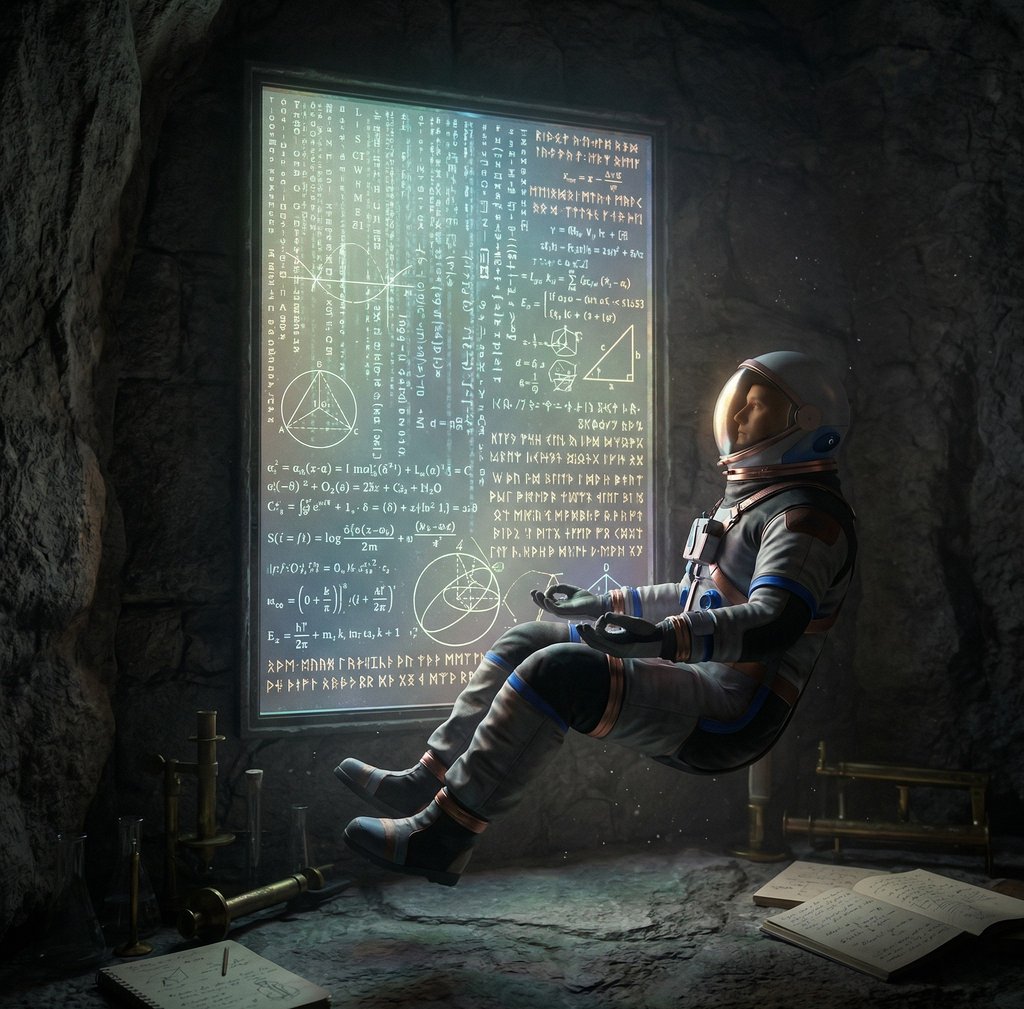 The central image of our meditation is that of an astronaut, suspended in a silent, cosmic void. They are not merely observing stars; they are floating in profound stillness before a crystalline panel that pulses with intricate, glowing equations and cascading symbols. It is the perfect metaphor for the human condition.