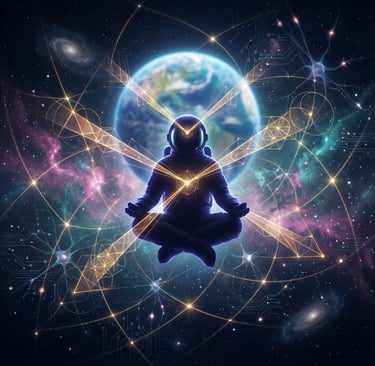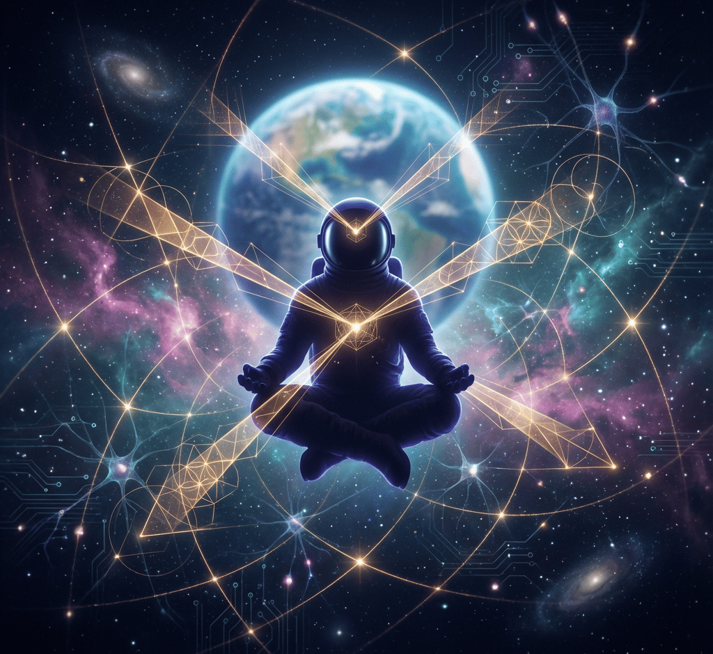 To embody the Meditating Astronaut is to inhabit a perspective that transcends the earthly. It is as if you are floating above the noise, witnessing both the cold, precise architecture of the digital world and the warm, living pulse of the collective web of life at the same time. From this vantage, the borders we draw on earth, whether political, cultural, or religious, start to fade and lose their importance.